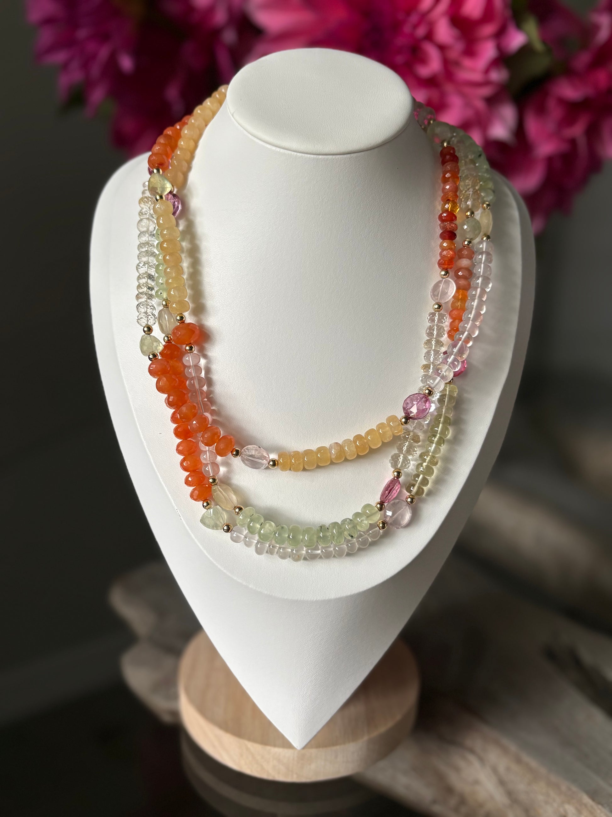 - Rose Quartz. Yellow Chalcedony, Pink Topaz. Prehnite, Citrine, Carnelian, Lemon Quartz, and Yellow Aventurine
